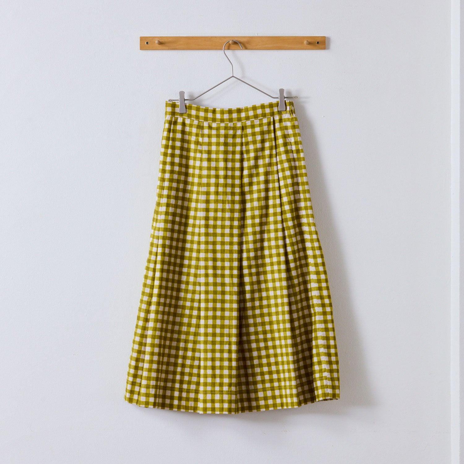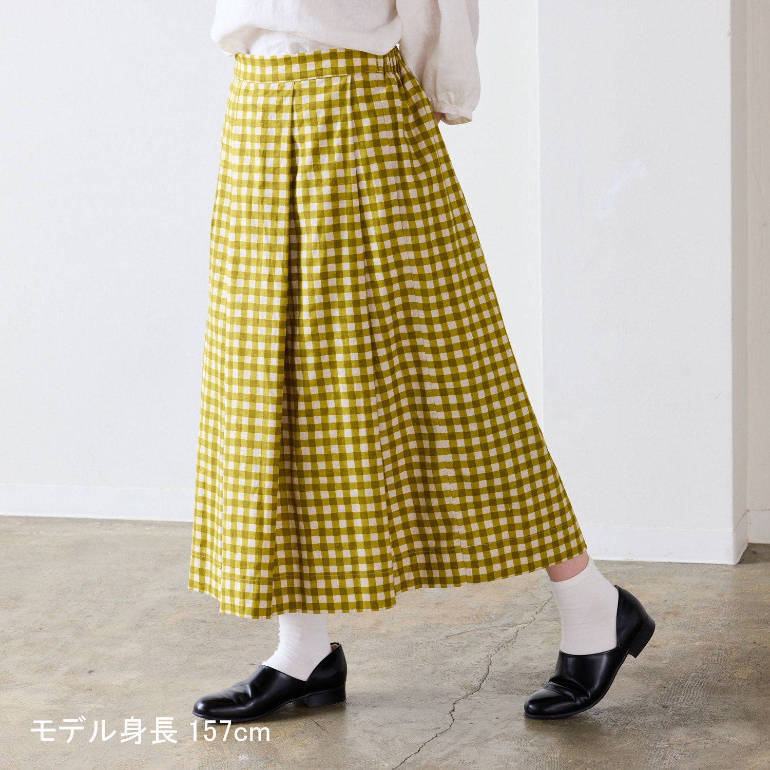 中心寄せのタックがデザインアクセントのタックスカート。