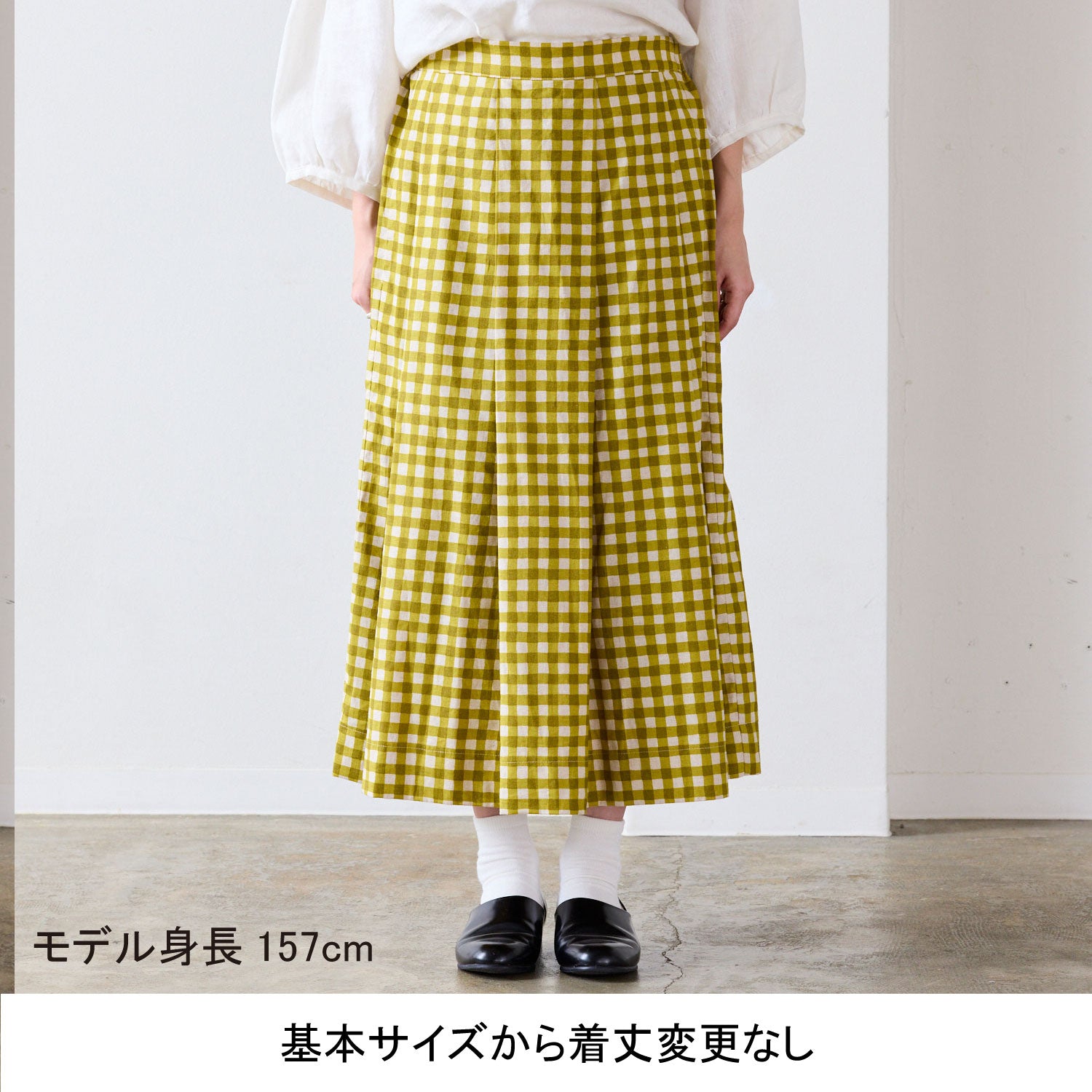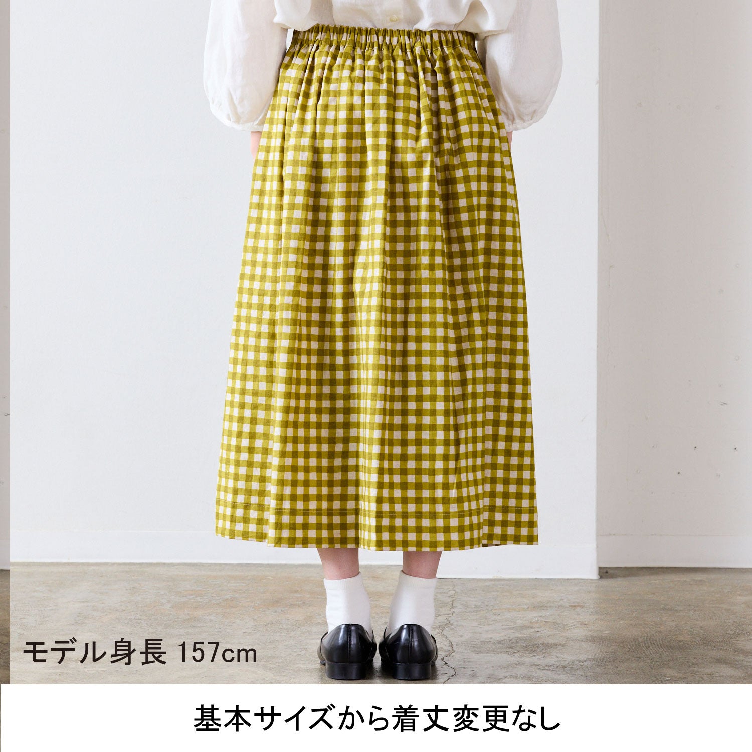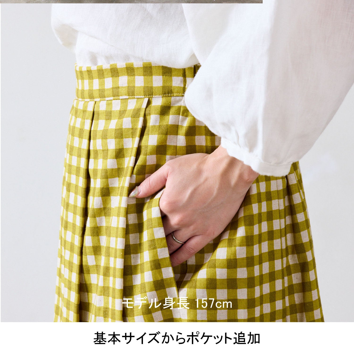 《例》タックスカートにポケットを追加し、着丈を5cm長くする場合は生地用尺210cmに20cmをプラスした230cmご購入ください。