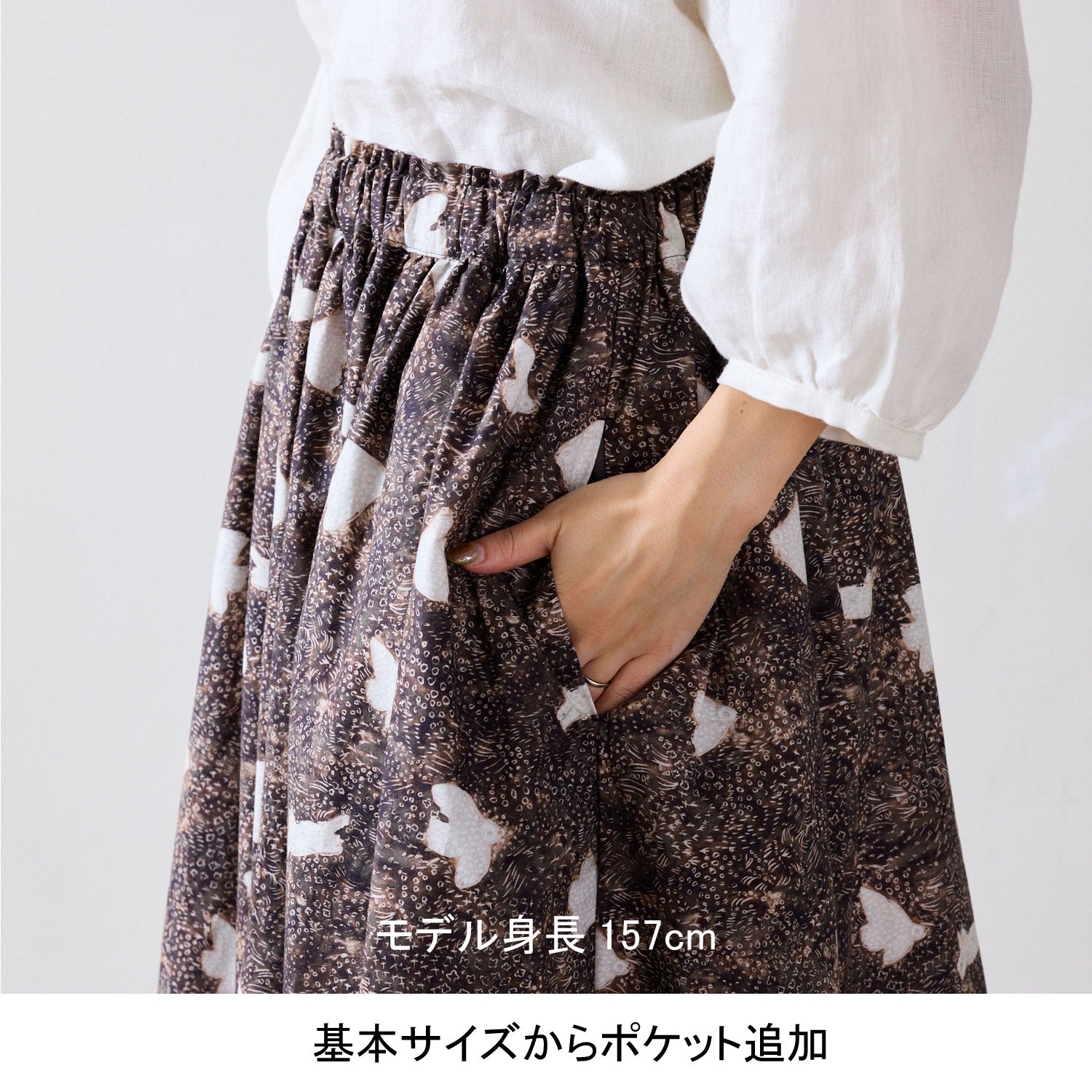 《例》タックスカートにポケットを追加し、着丈を5cm長くする場合は生地用尺210cmに20cmをプラスした230cmご購入ください。