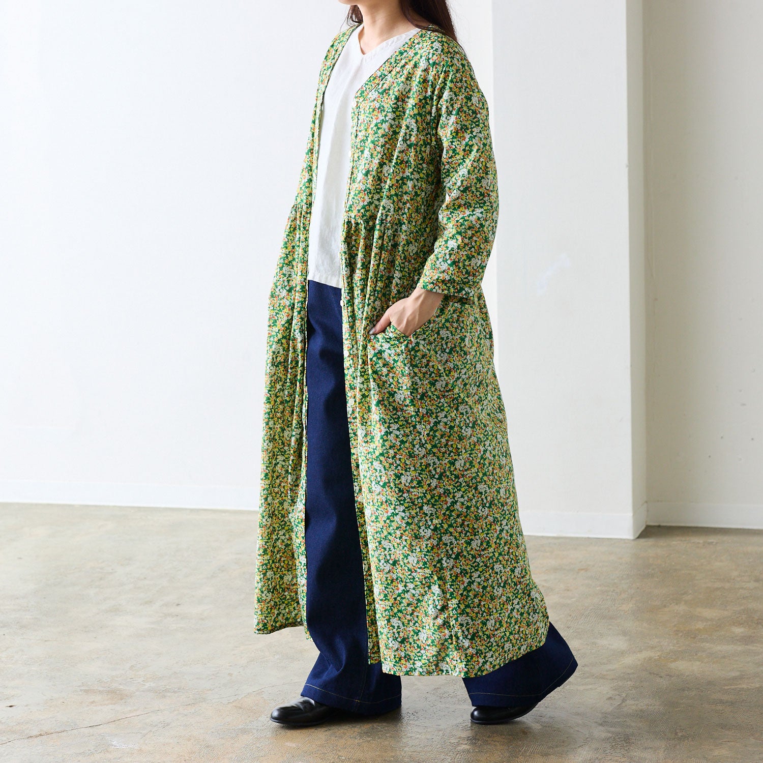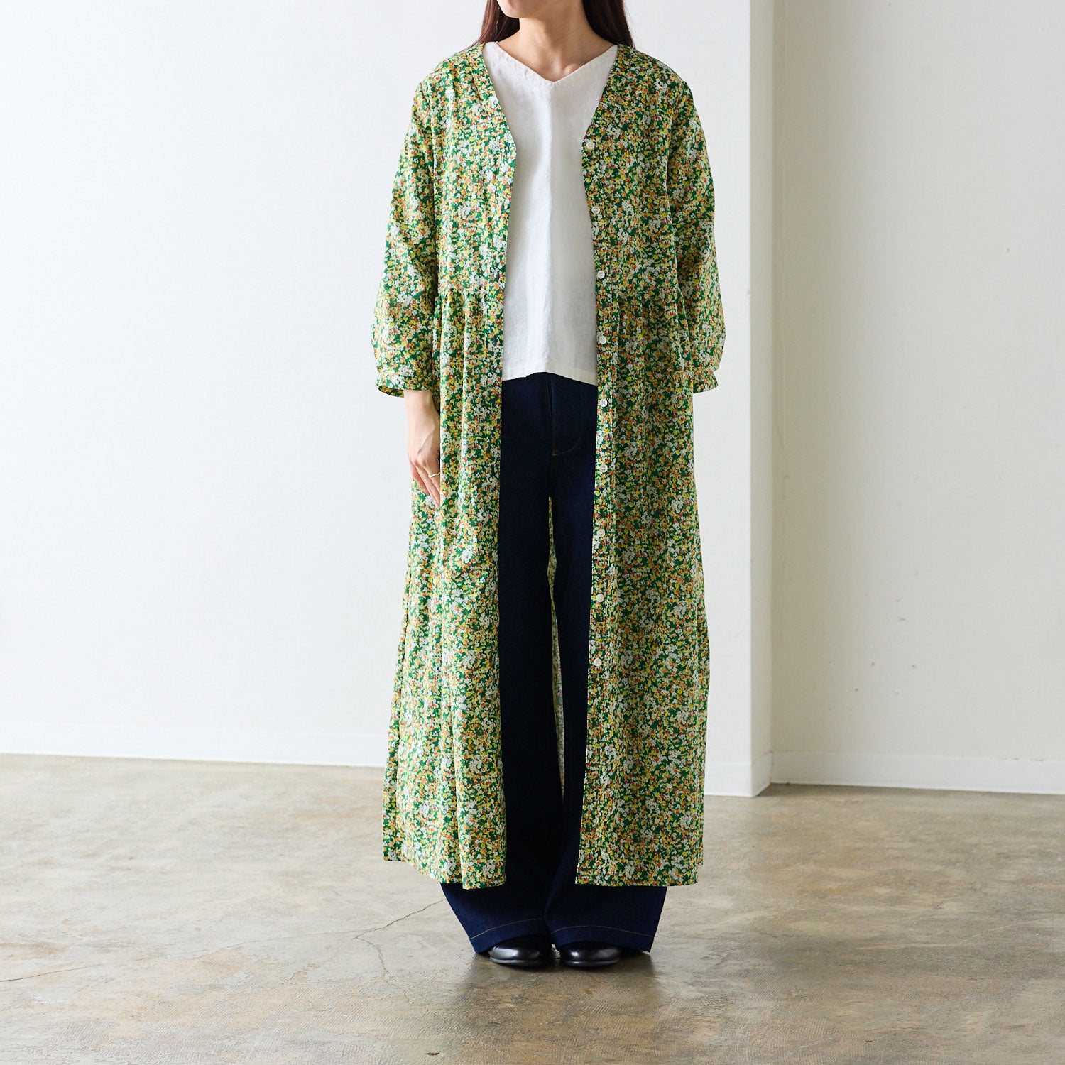 ワンピースとしても、羽織としても使えるVネックワンピース。