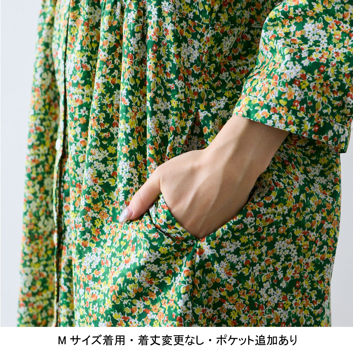 《例》Mサイズで着丈を5cm長く、ポケットを追加する場合は生地を420cmご購入ください。