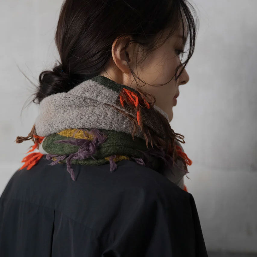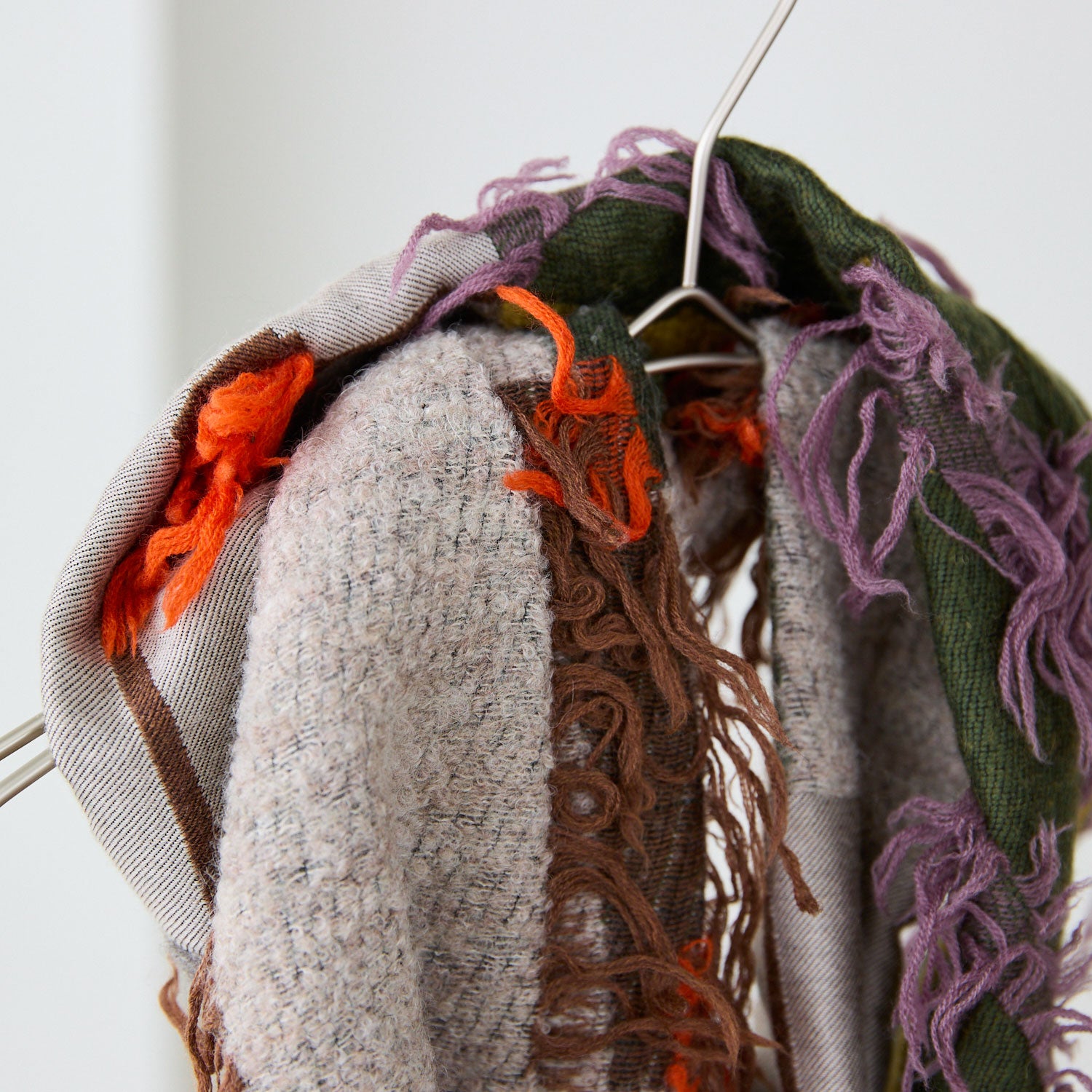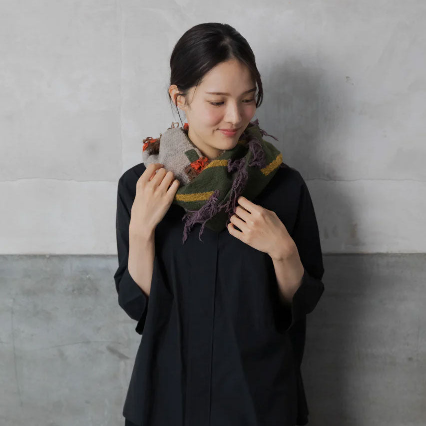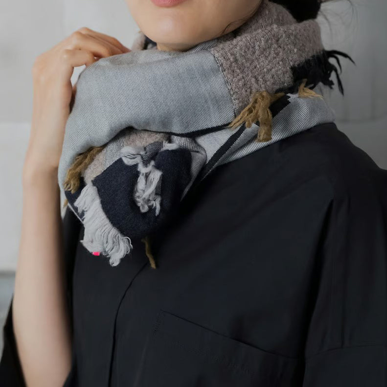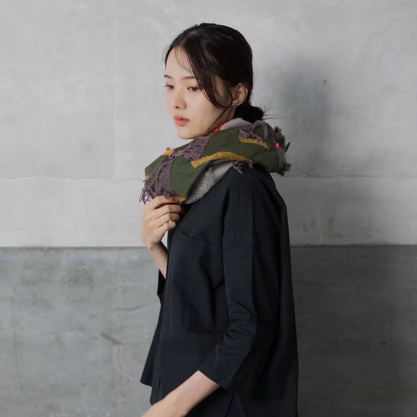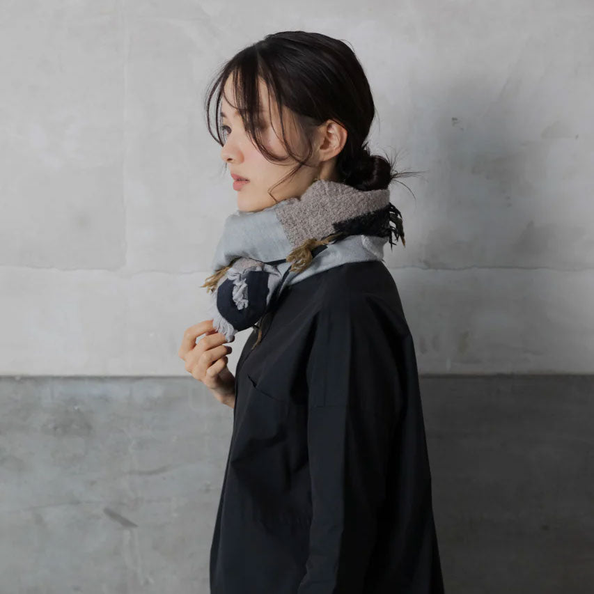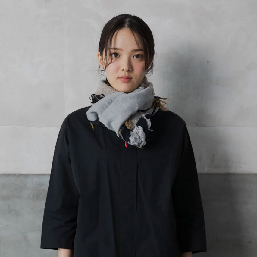 綿とウール素材の組み合わせによる軽さやカットした横糸がフリンジのように飛び出ている表面感が面白いストールです。
