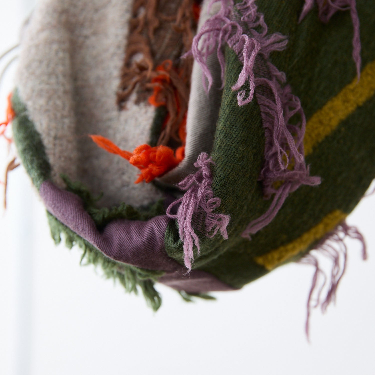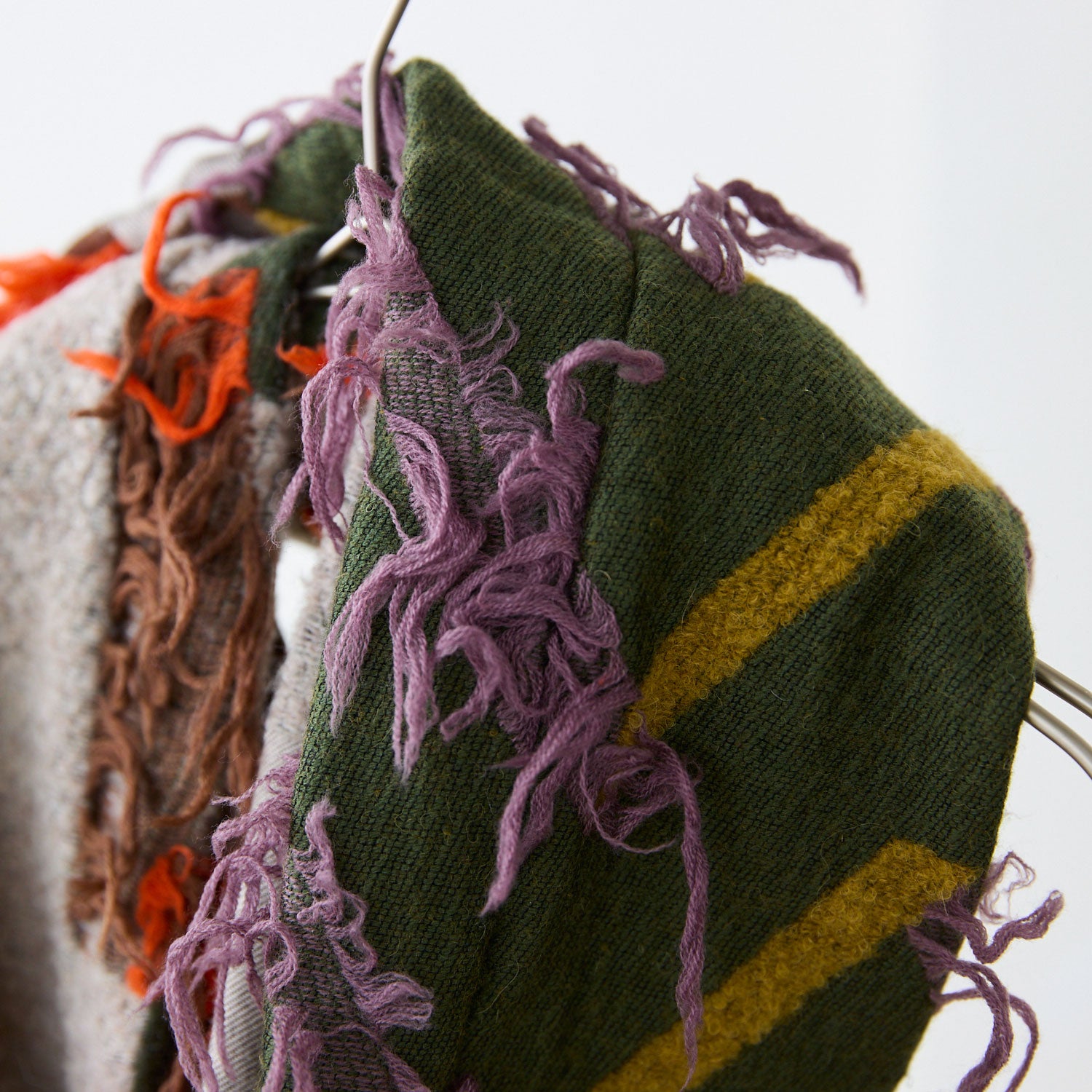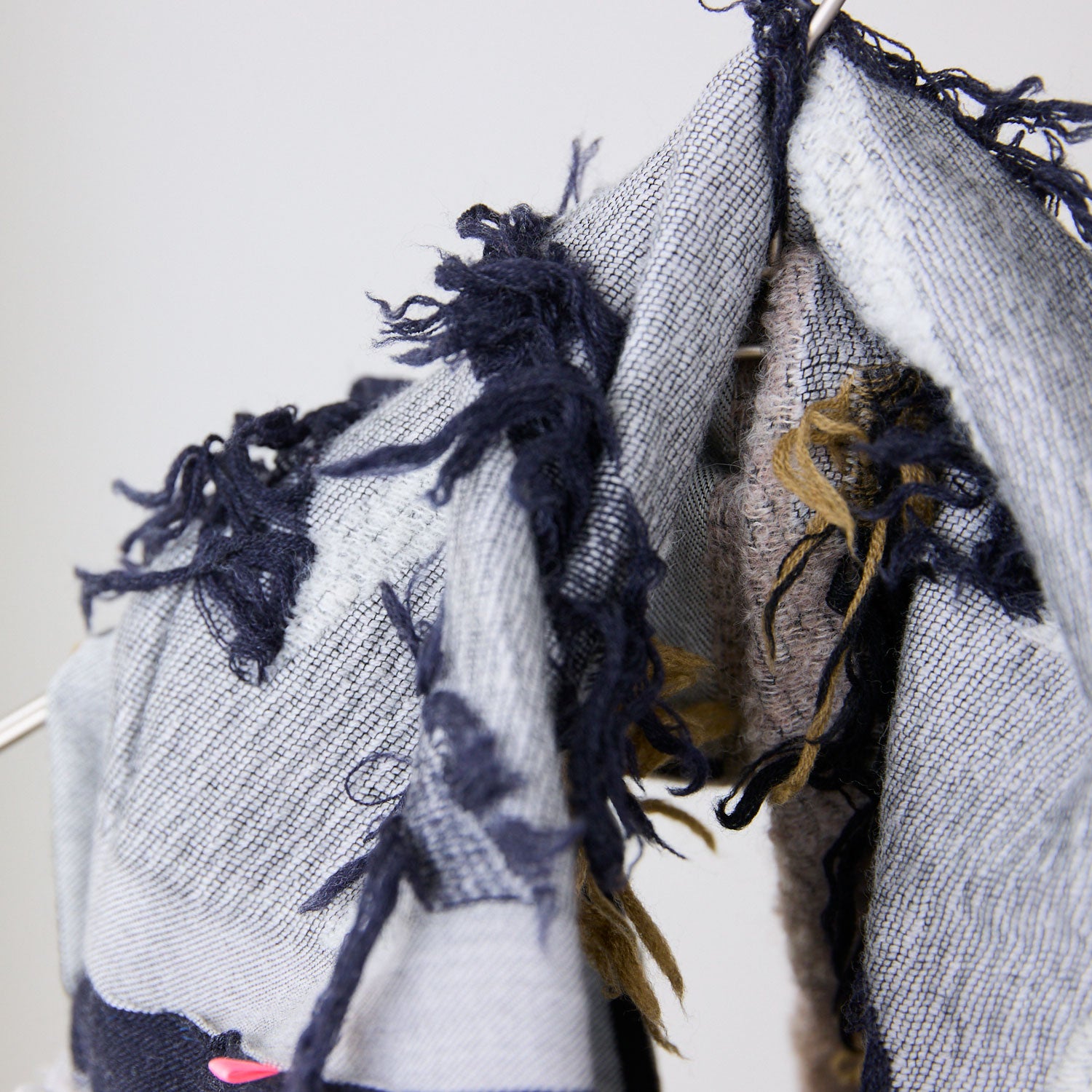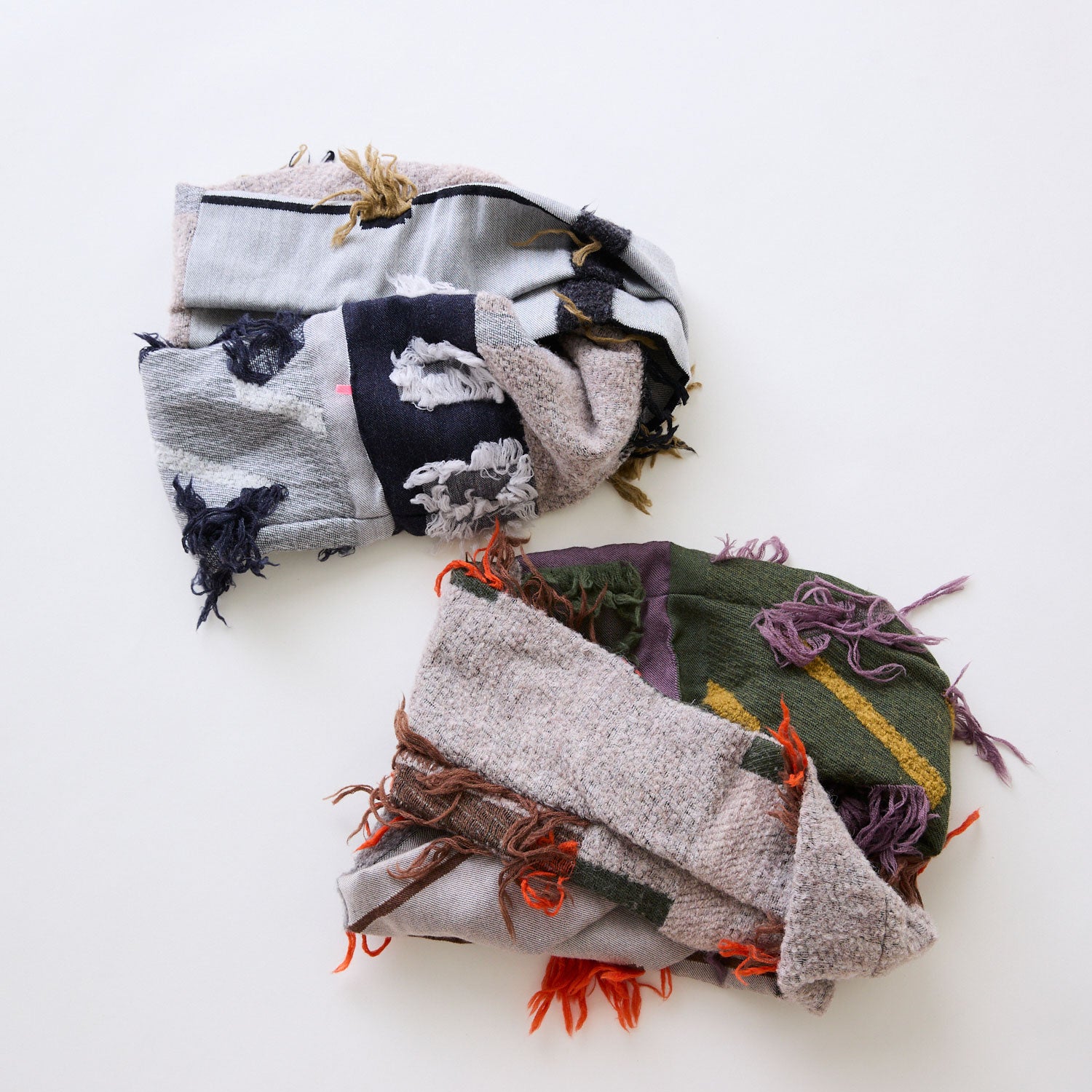 綿とウール素材の組み合わせによる軽さやカットした横糸がフリンジのように飛び出ている表面感が面白いストールです。