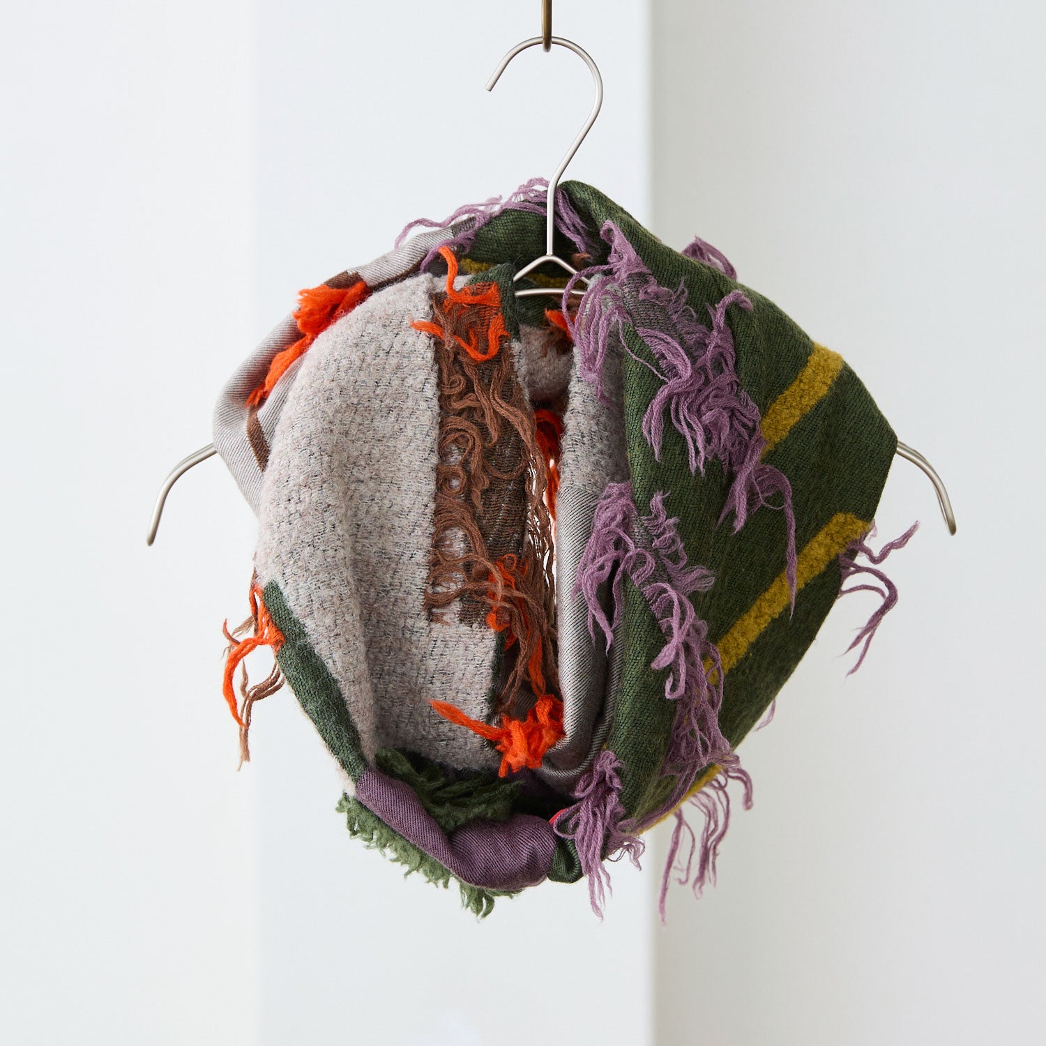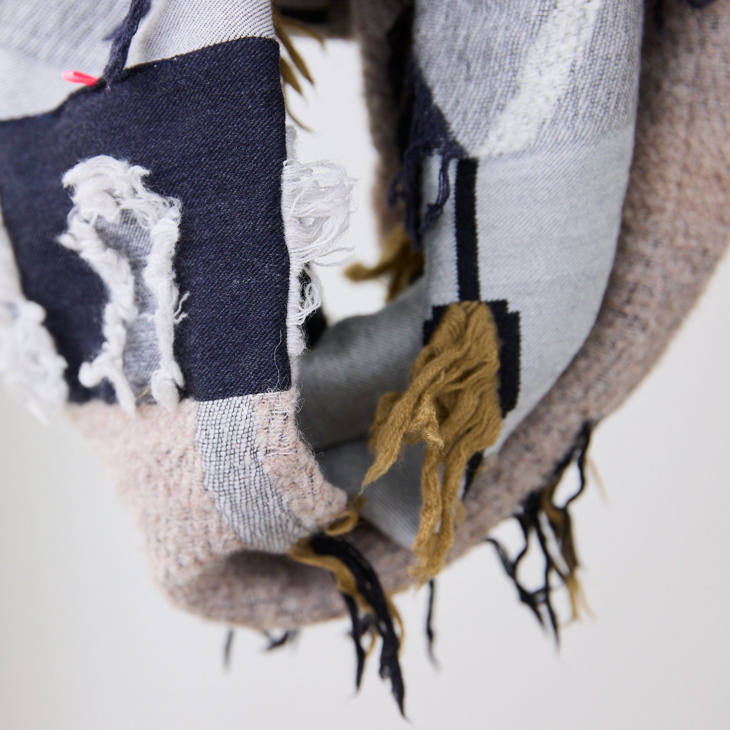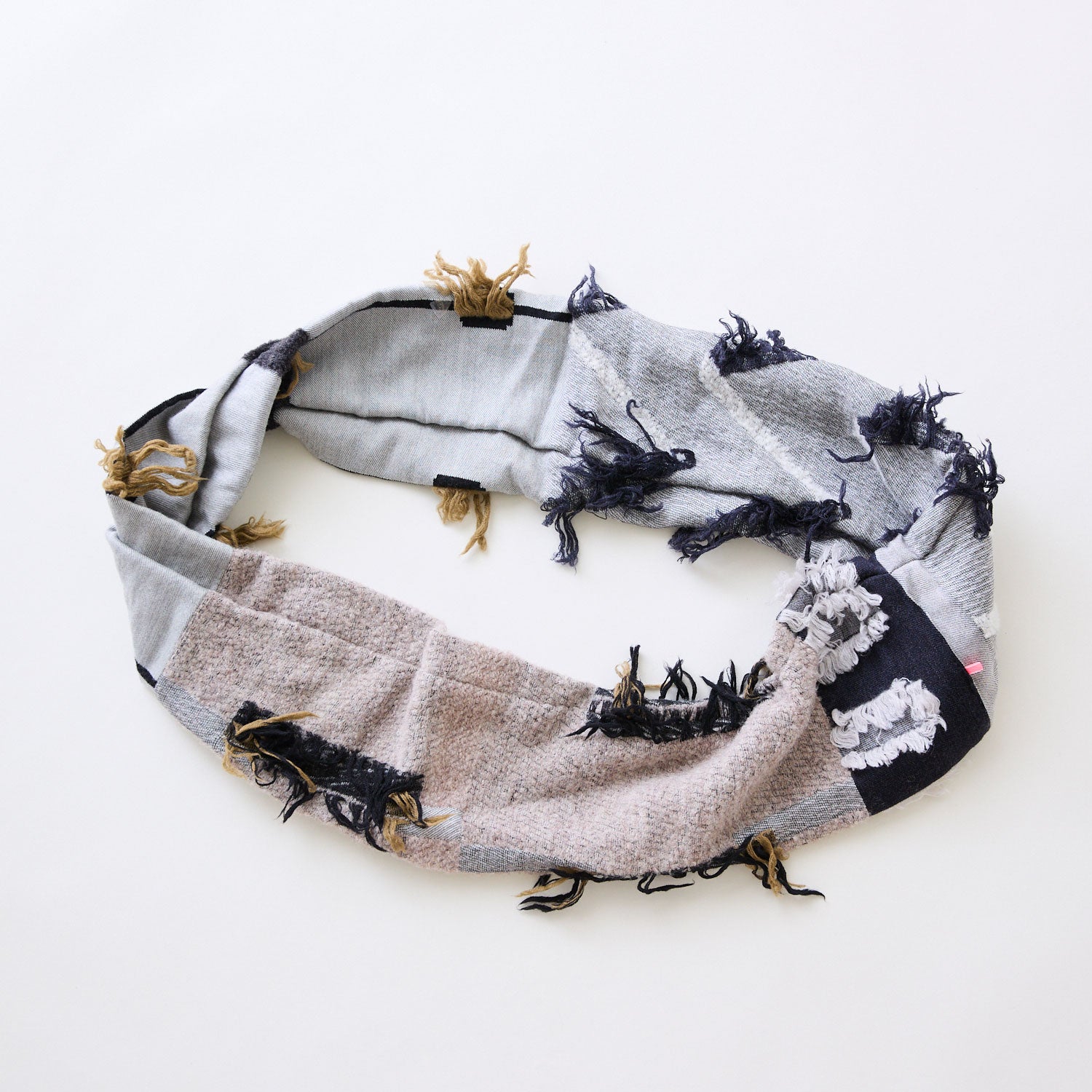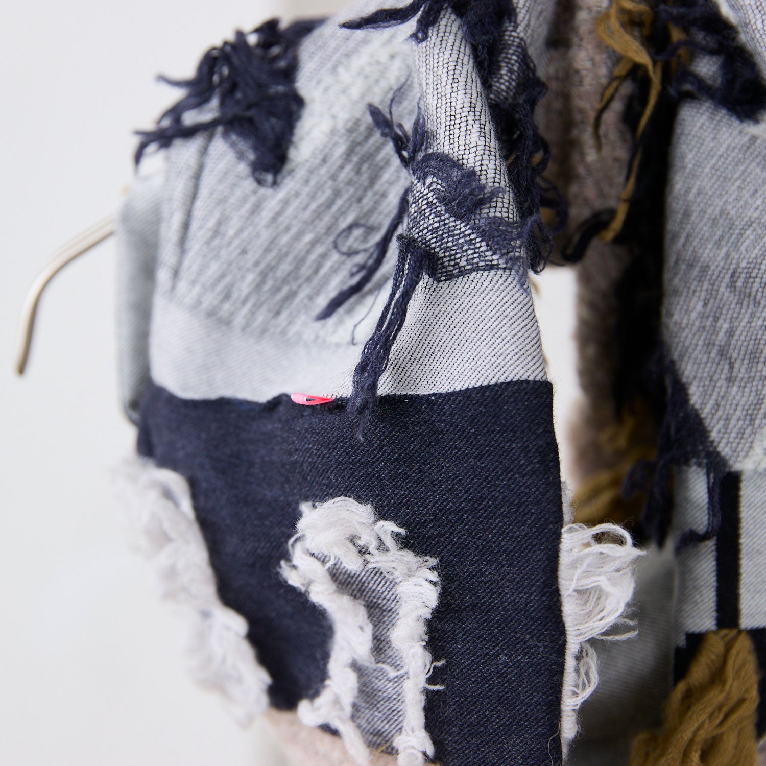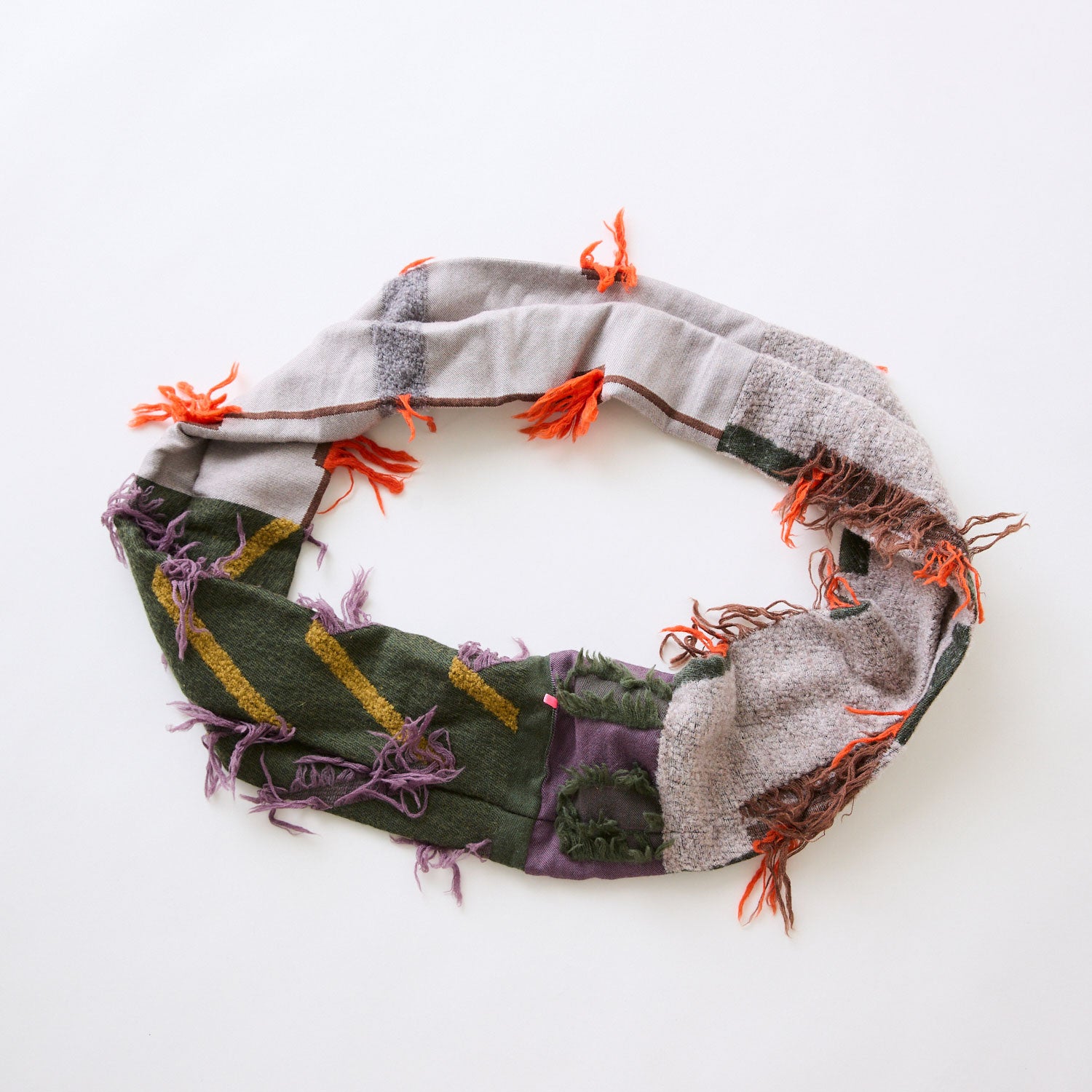 綿とウール素材の組み合わせによる軽さやカットした横糸がフリンジのように飛び出ている表面感が面白いストールです。