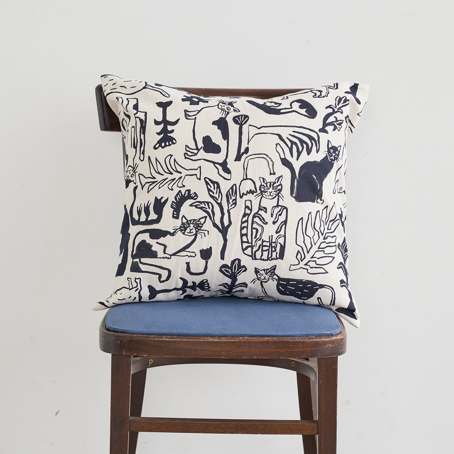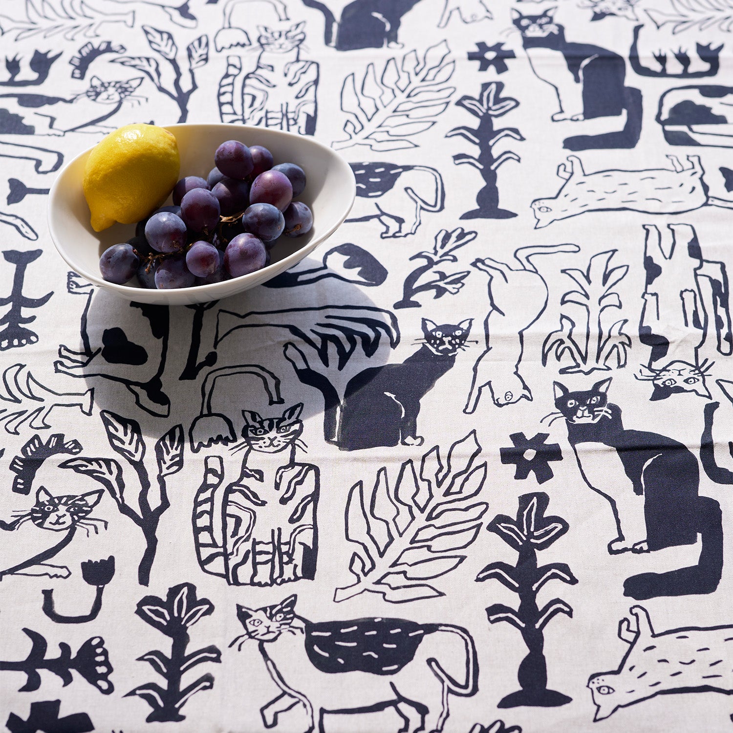 様々な表情の猫とお花など植物のモチーフと描かれたお洒落なデザイン。