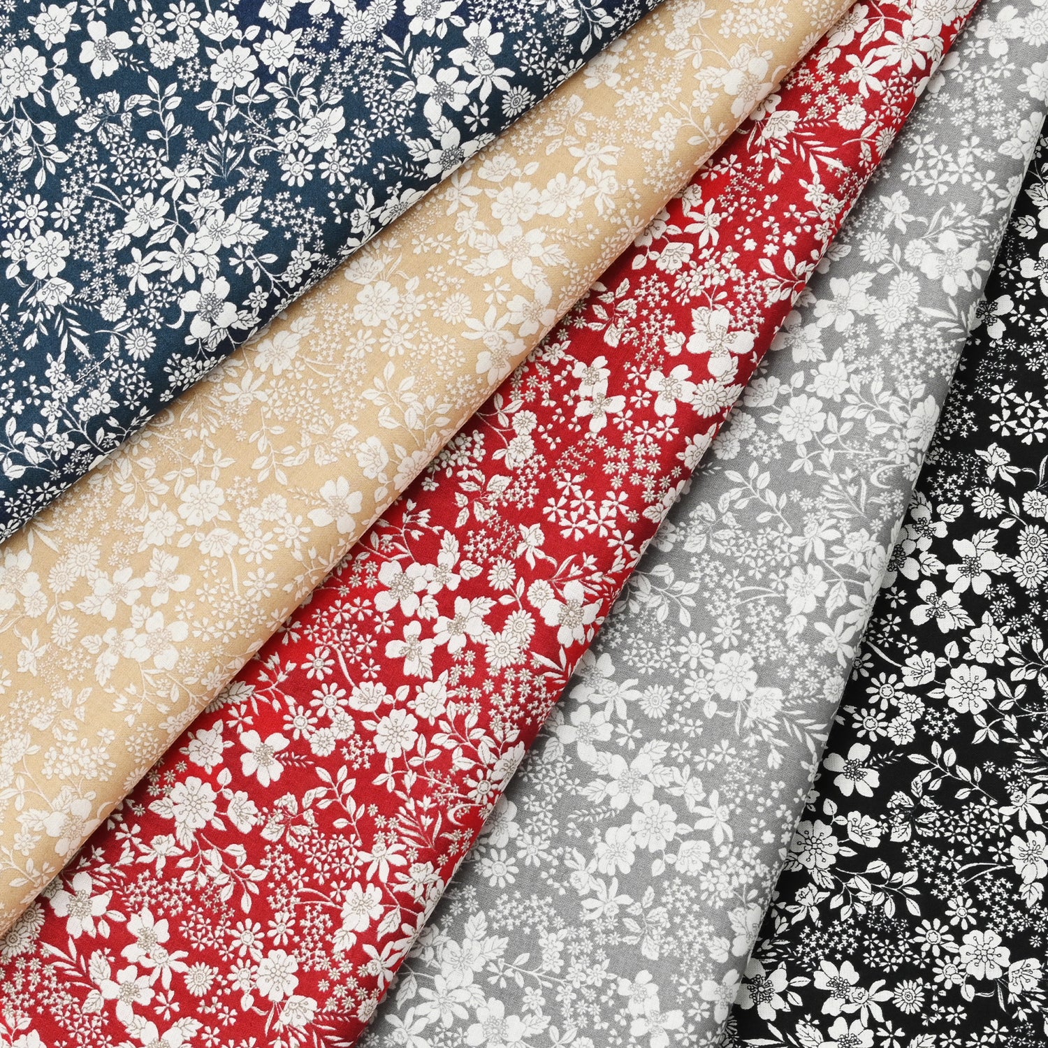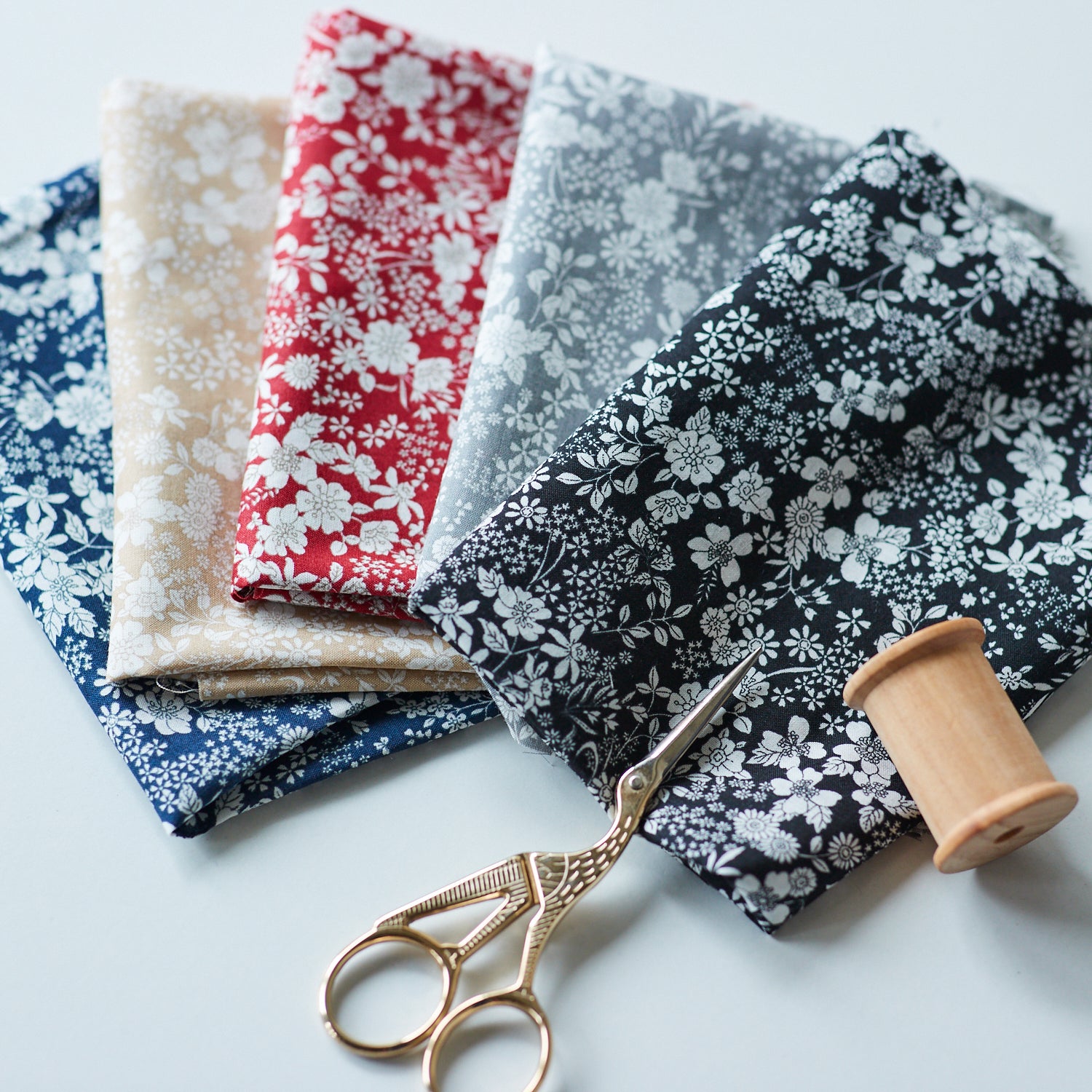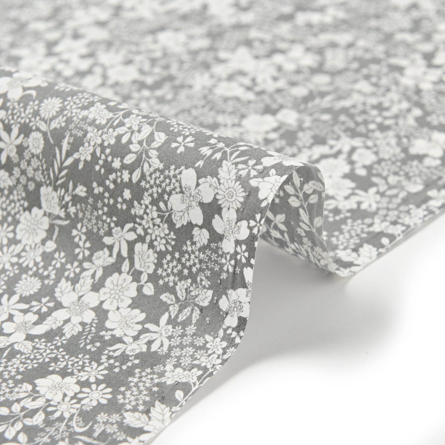 さらりとした薄手の綿ローン生地に小さな花や葉のモチーフを乗せたデザイン。