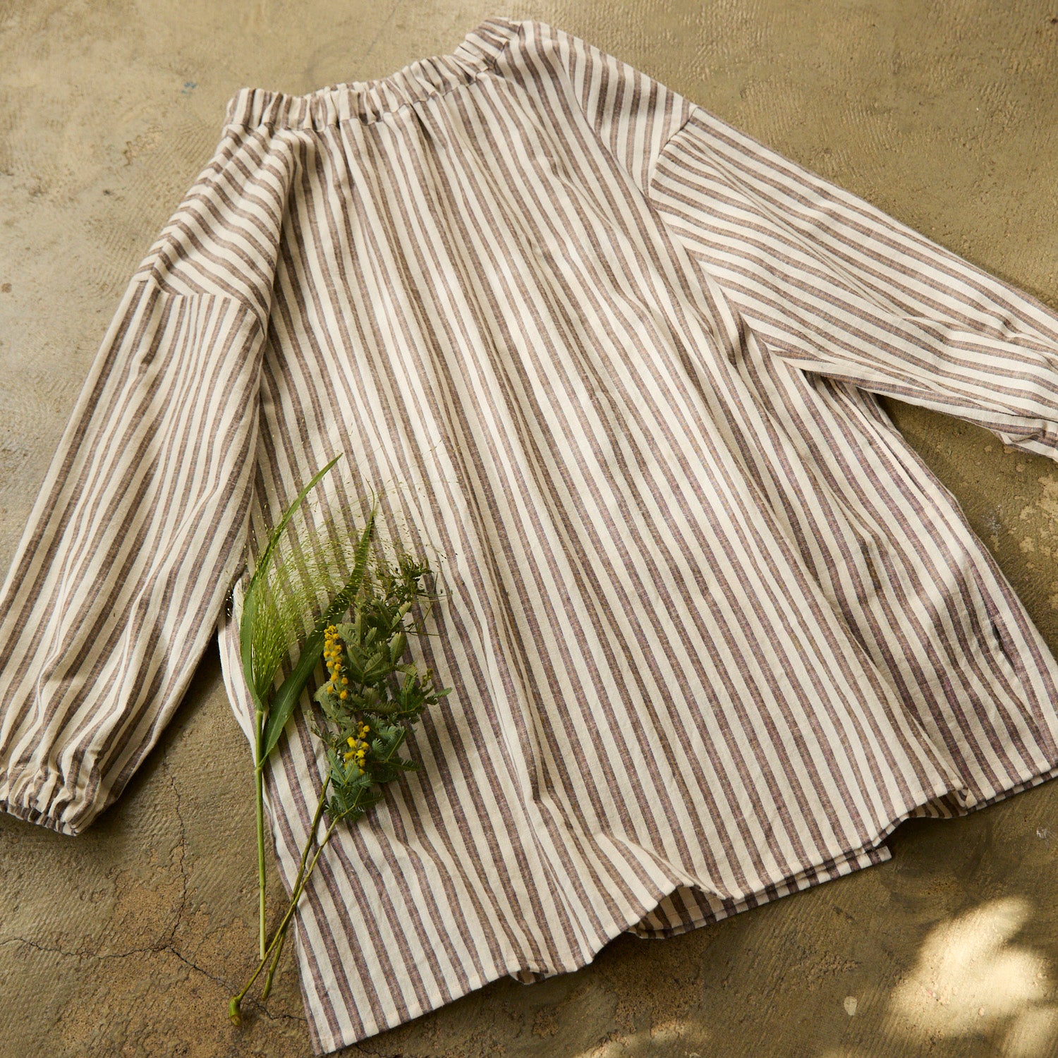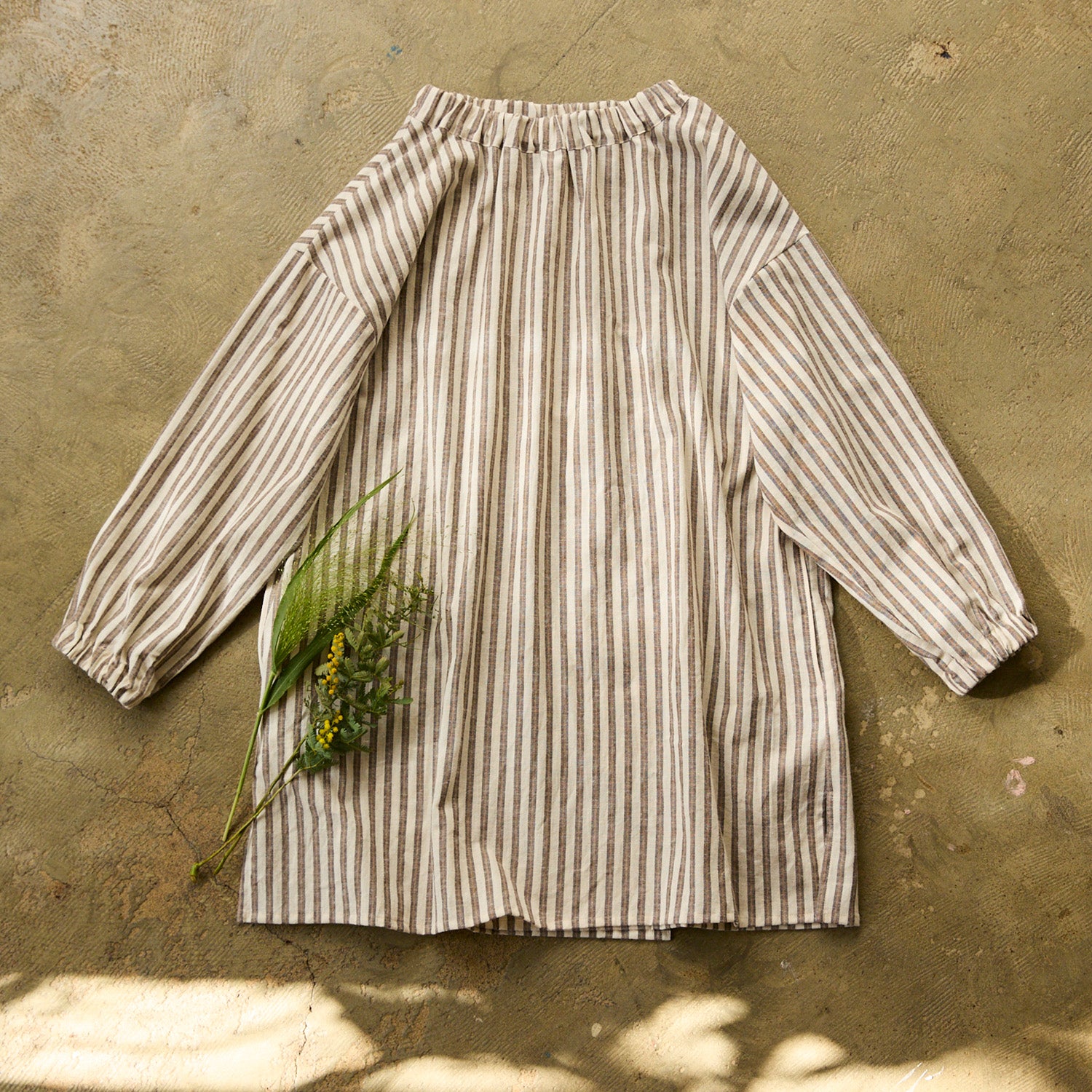 お子様向けのスモックよりも太めのゴムを入れることで少し襟元が立ったような印象になるので、お料理の際の油跳ねや水仕事の際のはね汚れも防いでくれます。