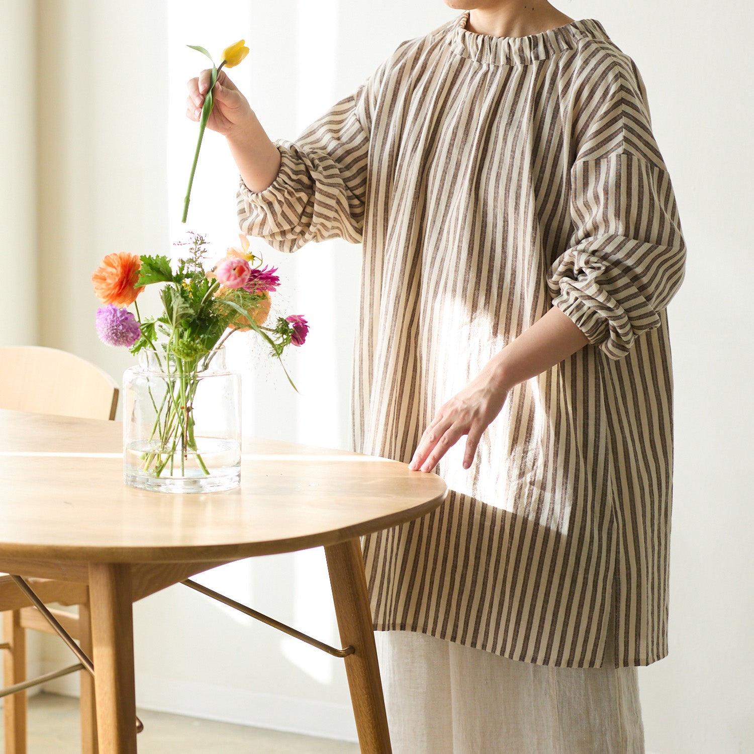 そこで首元は襟ぐりを横に広く取りつつも、太めのゴムを入れて鎖骨に沿って襟が少し立つような印象のデザインにしました。
