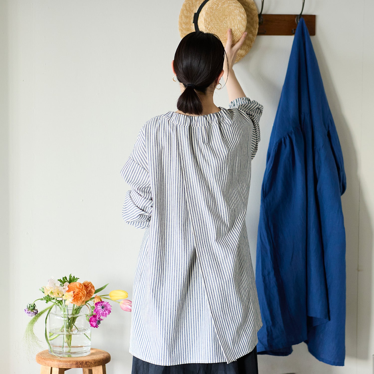 スモックと言えば丸首で襟がなく、丈の長い身頃に長袖があるデザインが特徴ですが、シンプルで機能的であるが故にどうしても作業着という印象に。そこで首元は襟ぐりを横に広く取りつつも、太めのゴムを入れて鎖骨に沿って襟が少し立つような印象のデザインにしました。