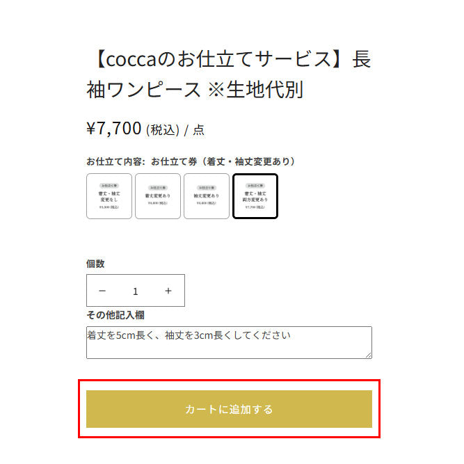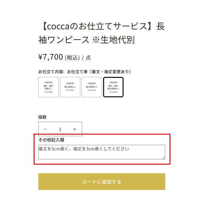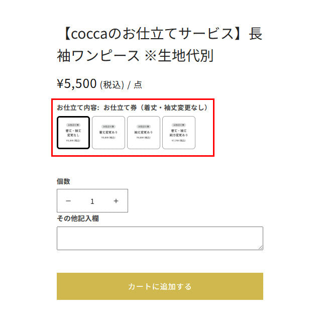 お仕立て券を選び、カートに入れる前に変更希望内容を「その他記入欄」に記載してからカートに入れてください。