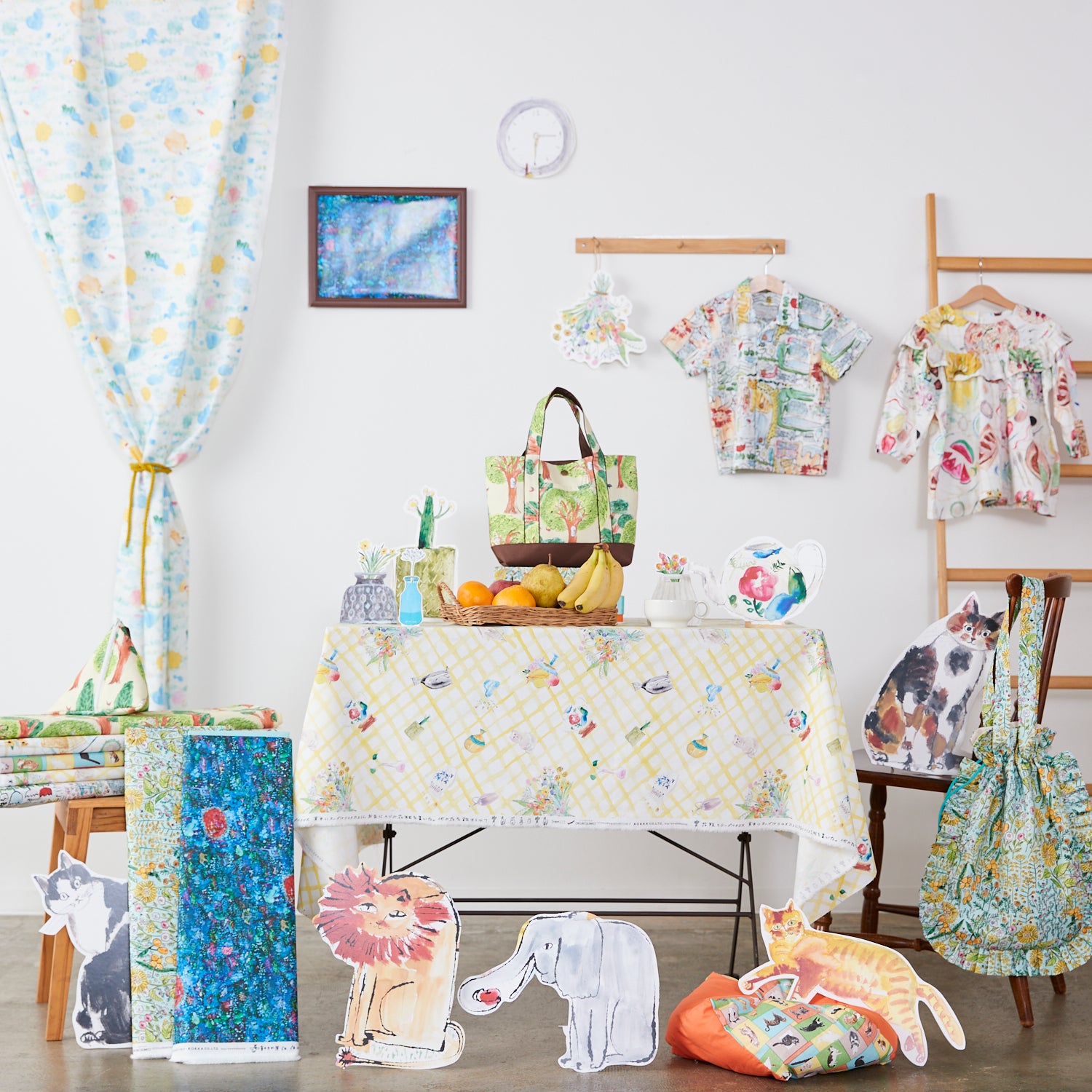 じんわり滲んだ色合いやラフなタッチで描かれた線は、大胆ながらも抽象絵画のような印象もあり、さまざまなアイテムに取り入れやすいテキスタイル。