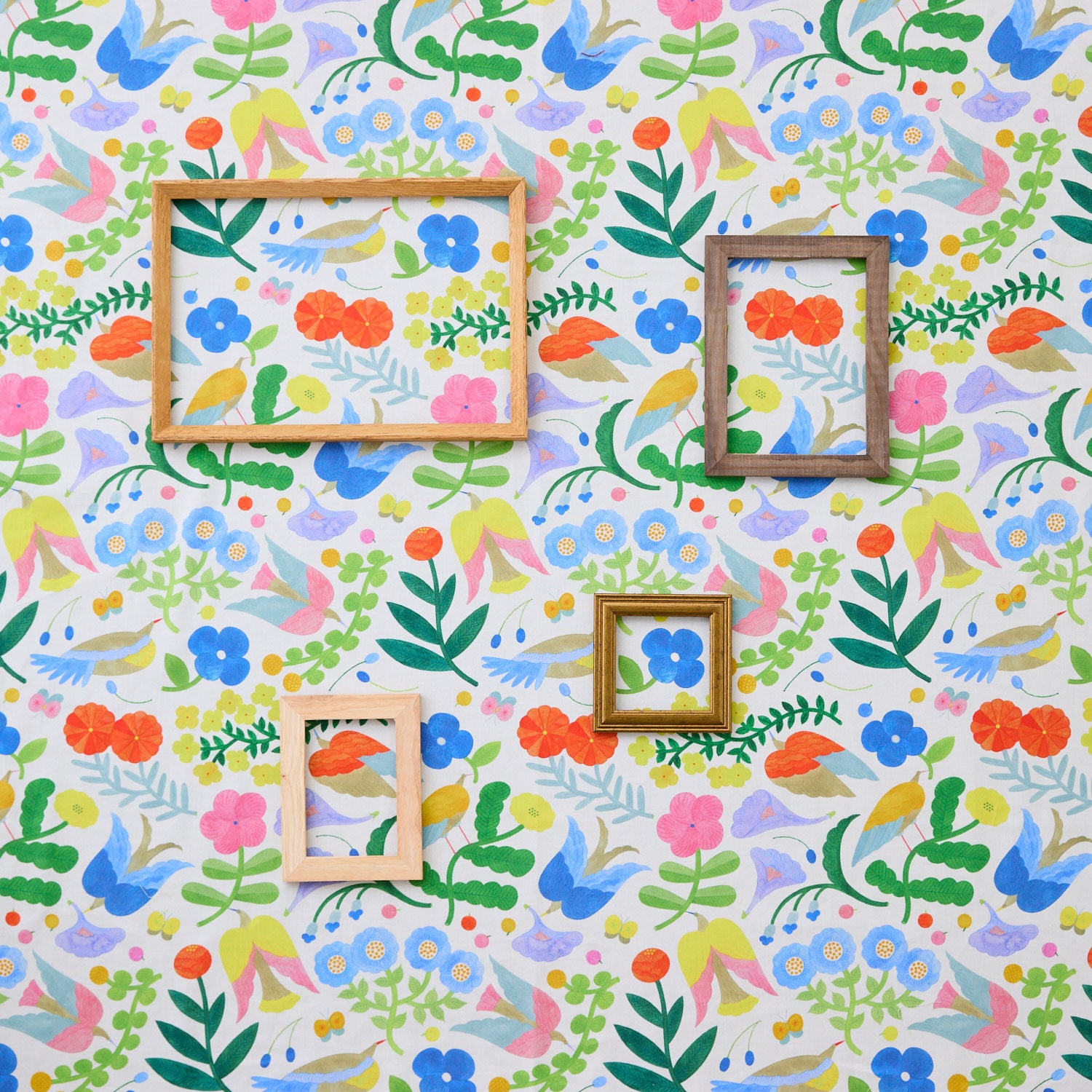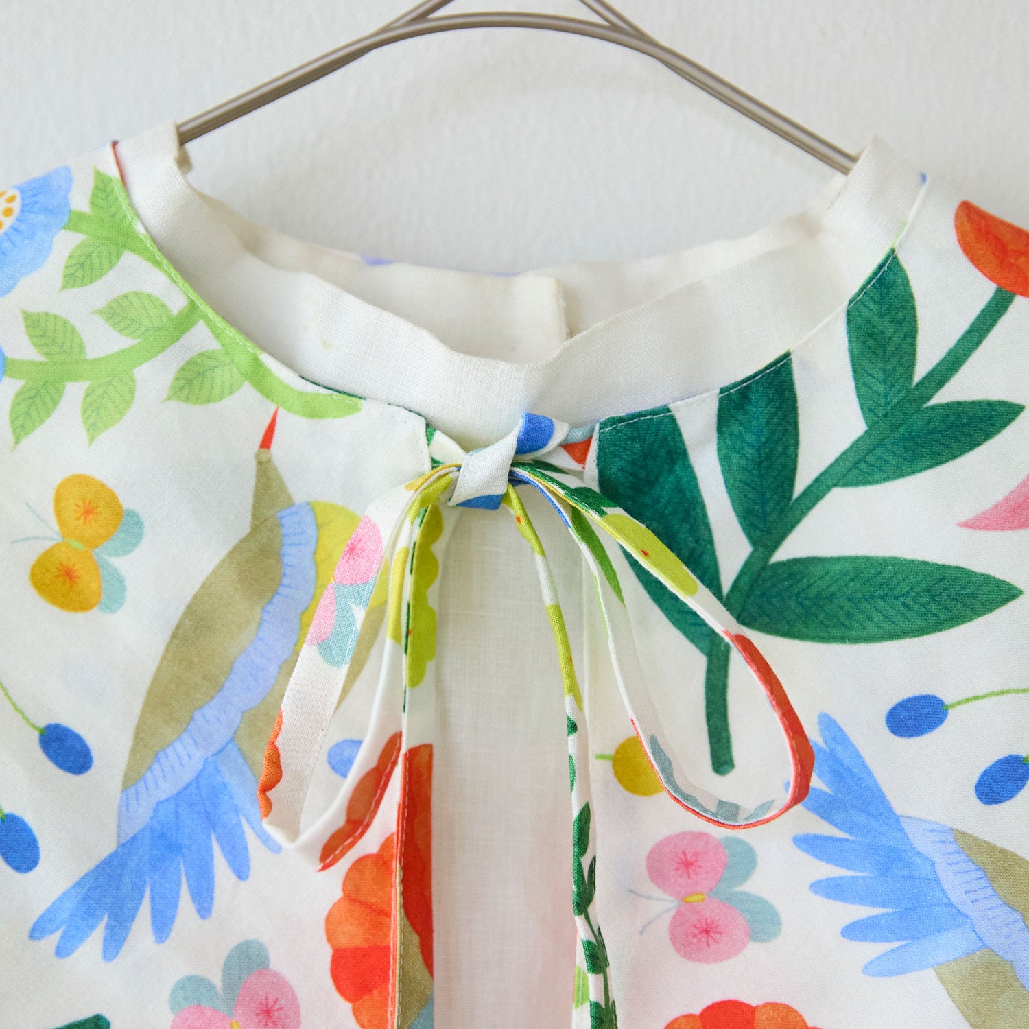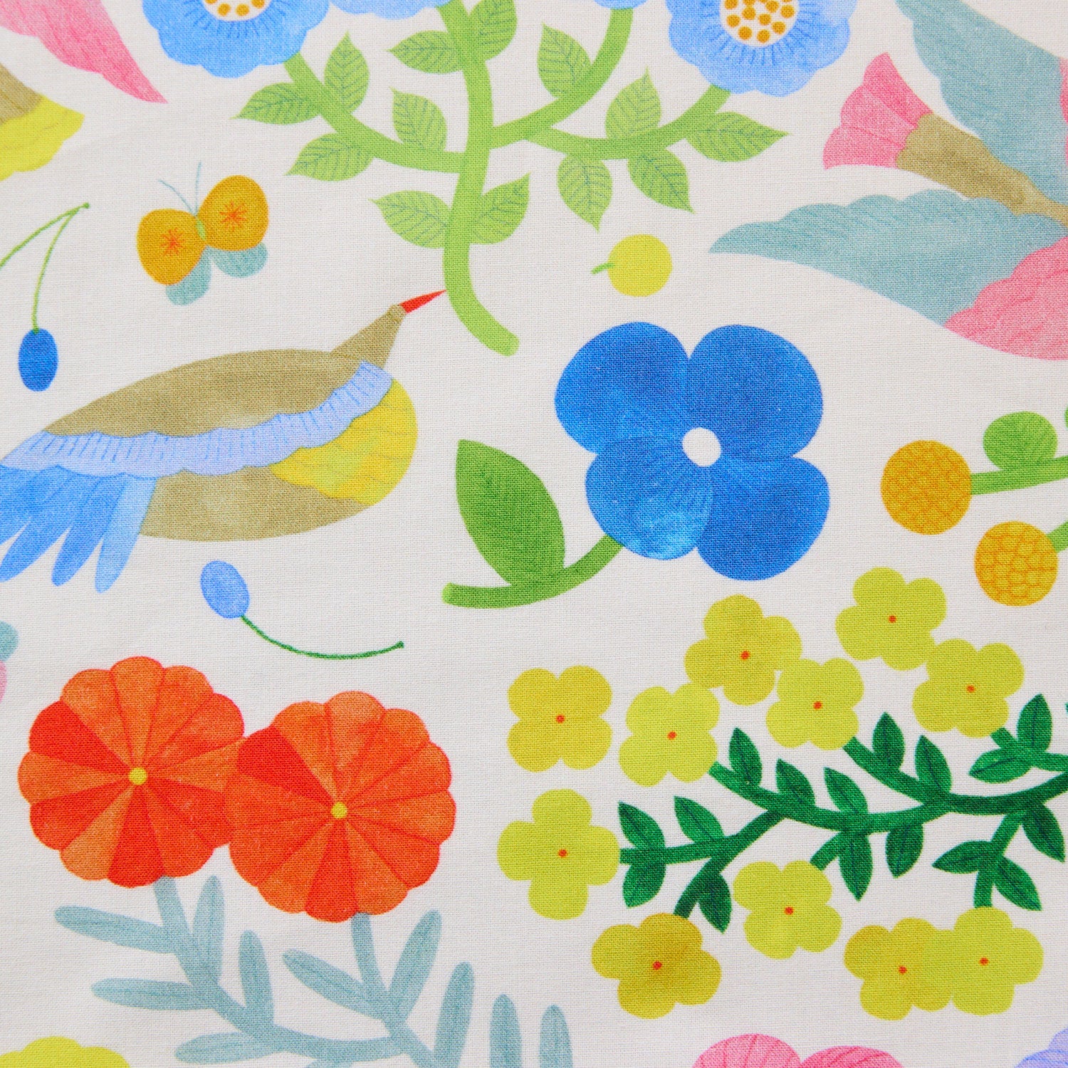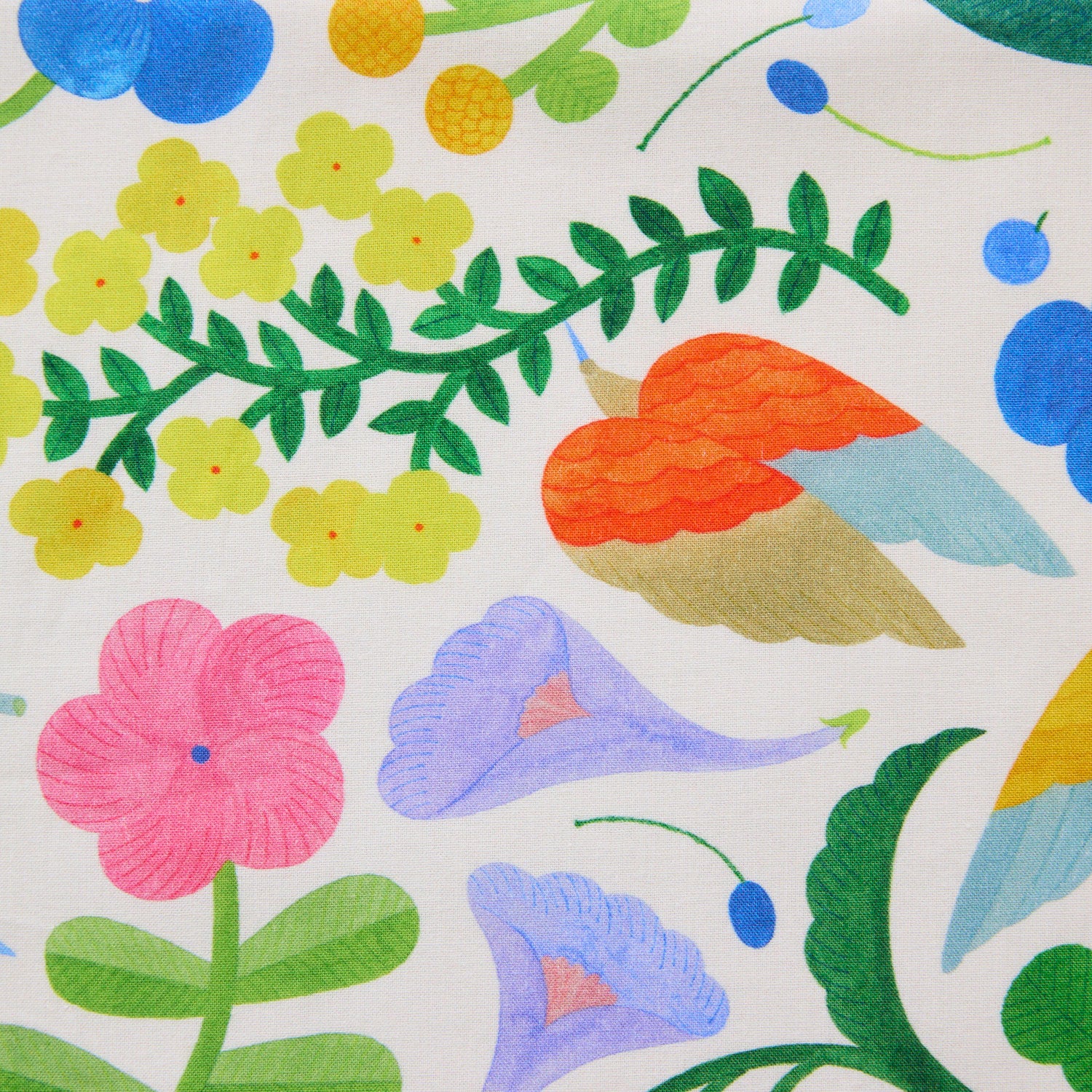 色とりどりのカラフルなお花と鳥たちが描かれた生地は、見ているだけで気分を盛り上げてくれます。