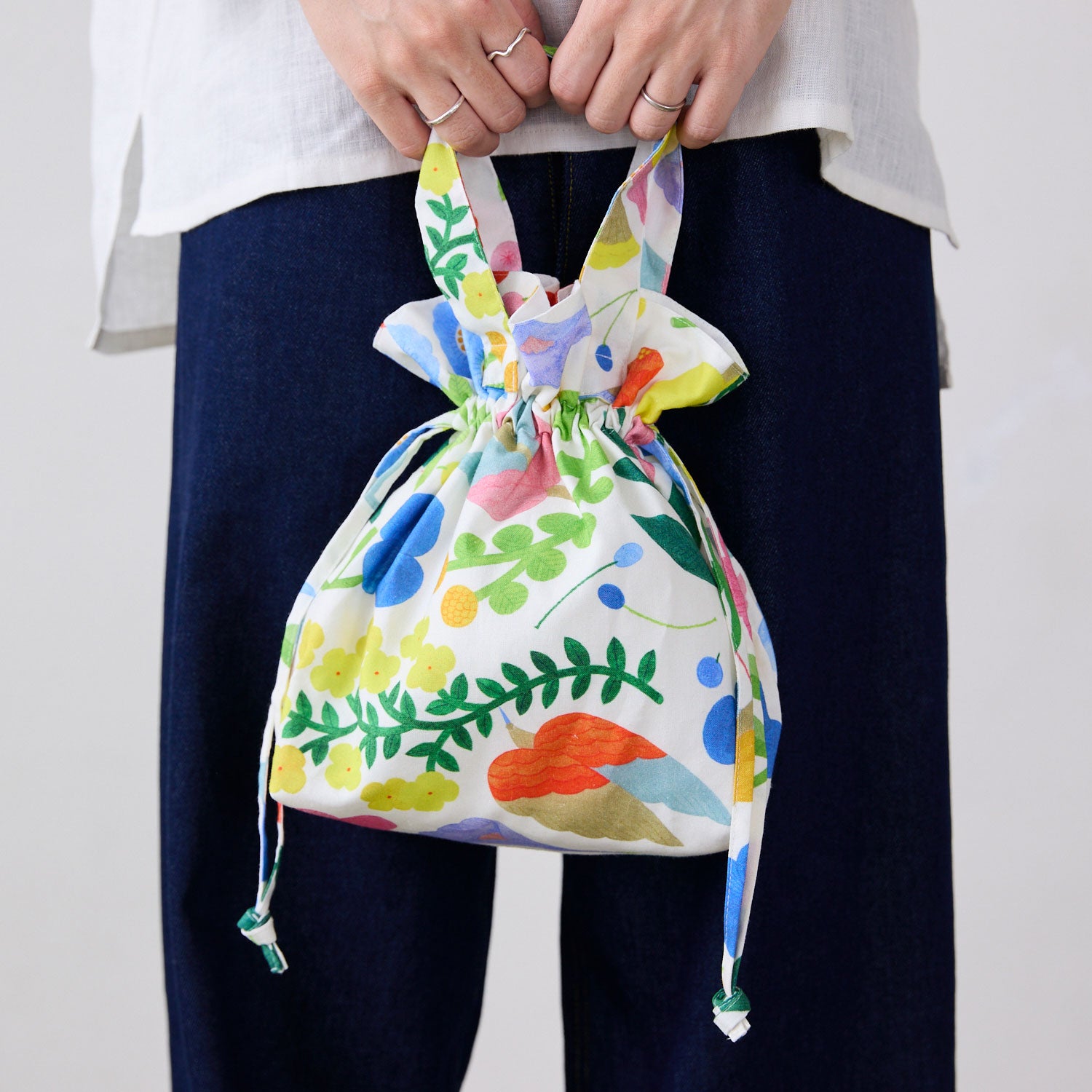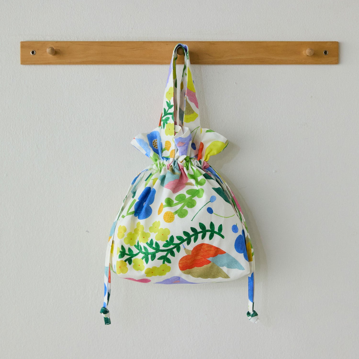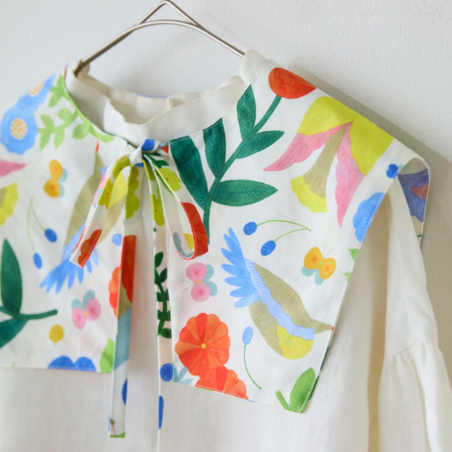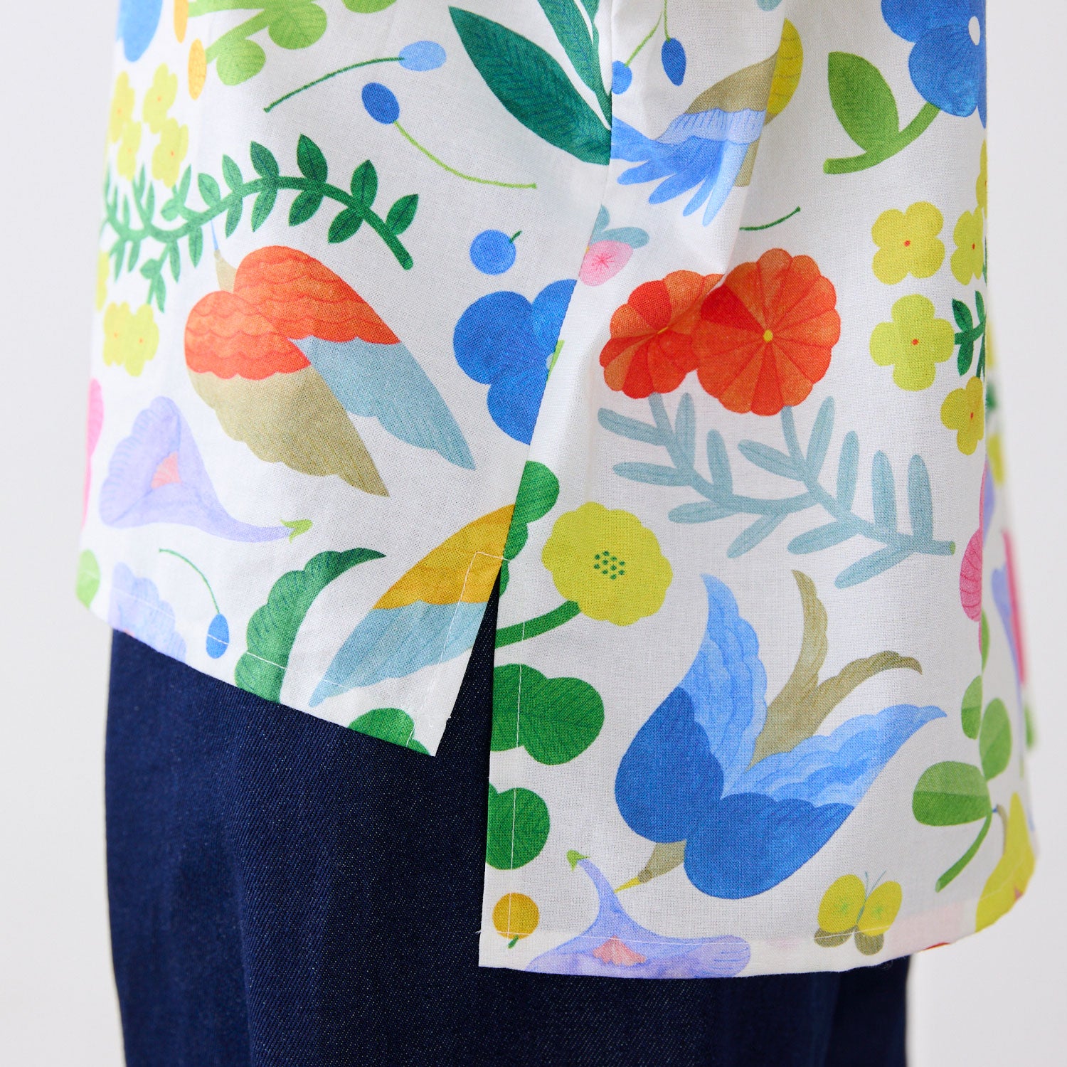 色とりどりのカラフルなお花と鳥たちが描かれた生地は、見ているだけで気分を盛り上げてくれます。